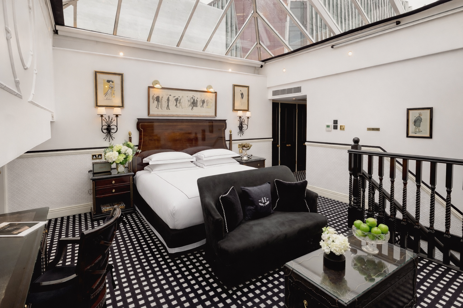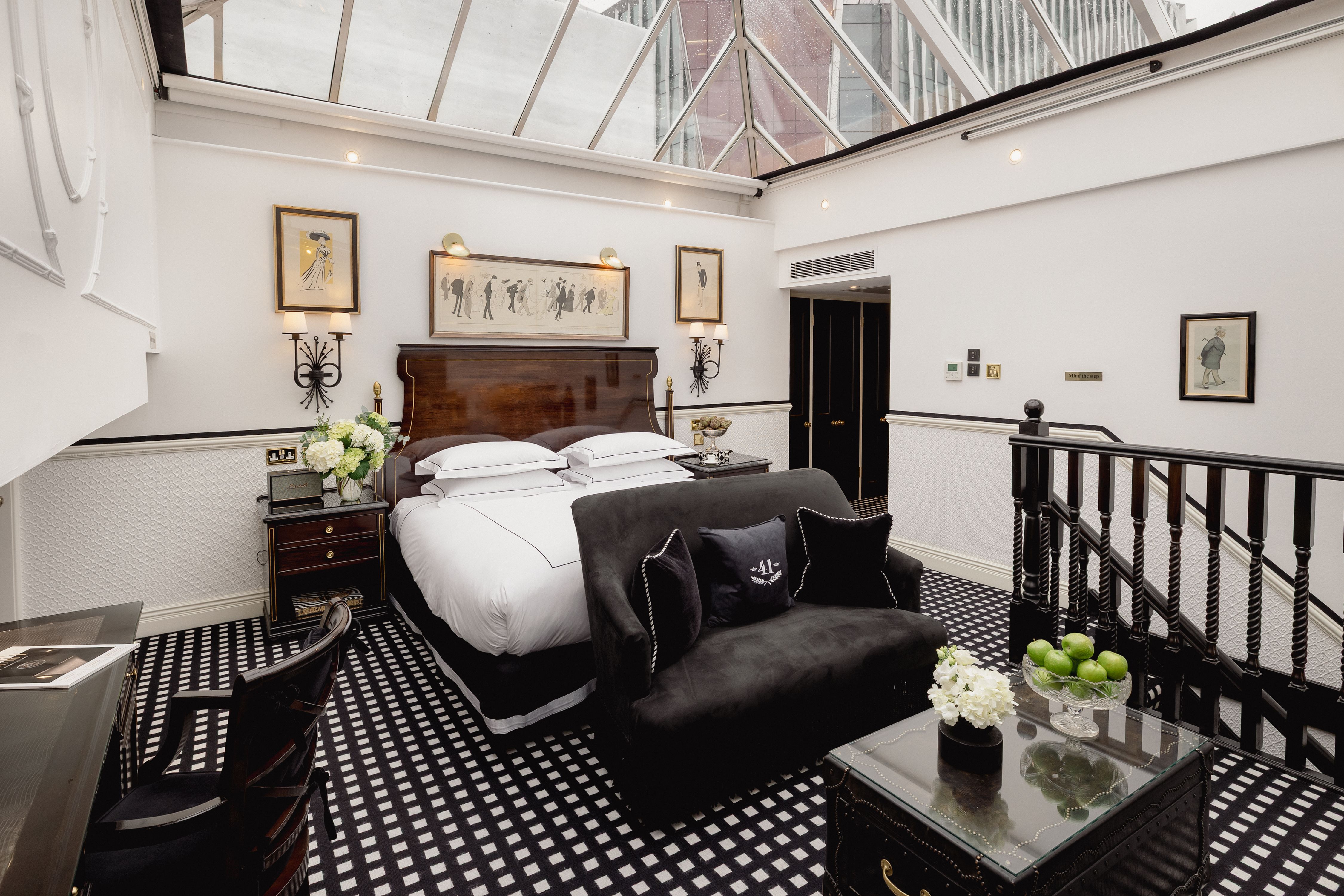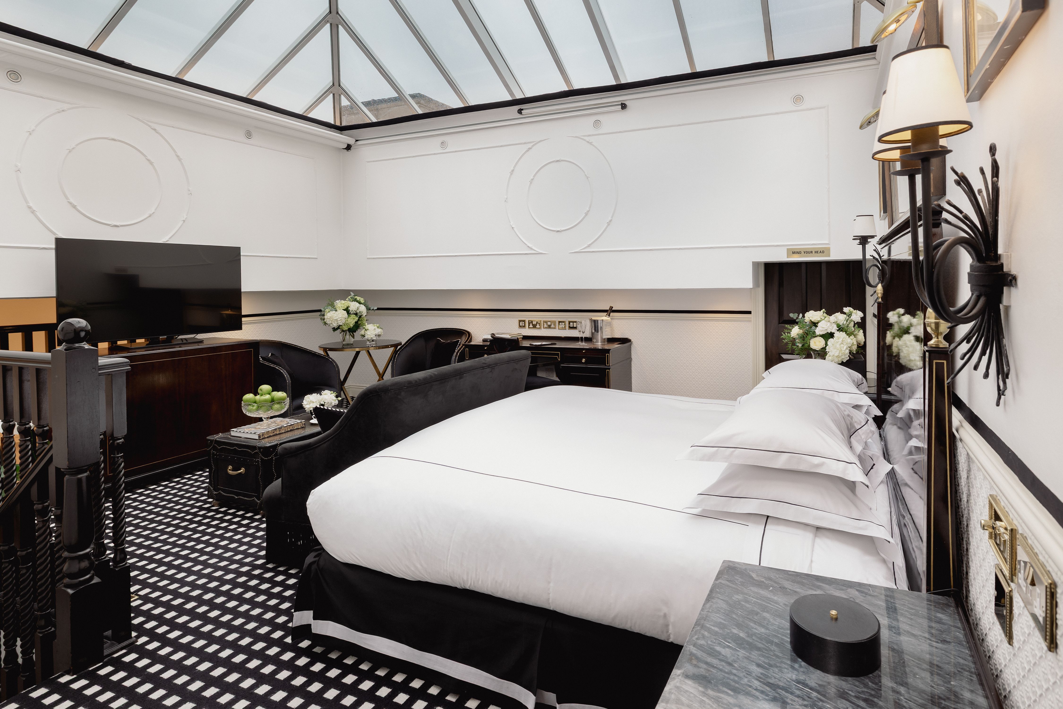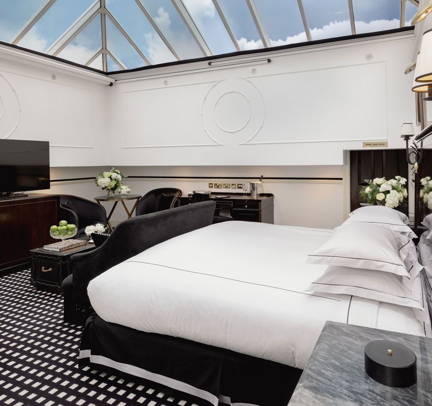 There is nowhere else in London quite like our Conservatory Suite. Arranged across two levels, the suite offers an intimate lounge with fireplace and guest bathroom below, while stairs lead to a spacious bedroom with an elegant dressing area and bathroom above. Overhead, the extraordinary conservatory ceiling defines the experience, filling the suite with natural light by day and inviting stargazing from your Savoir bed after dark. When privacy is preferred, electronic blinds discreetly close the space to the sky above.